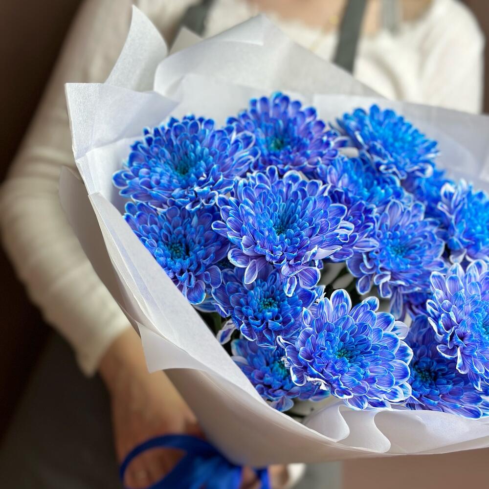 Откройте для себя завораживающую красоту Космоса в этом изысканном комплименте из трех синих хризантем. Хризантемы окрашены в глубокие тона фиолетового, синего напоминая мерцающие звезды в ночном небе!